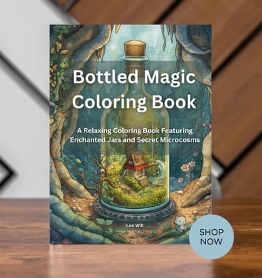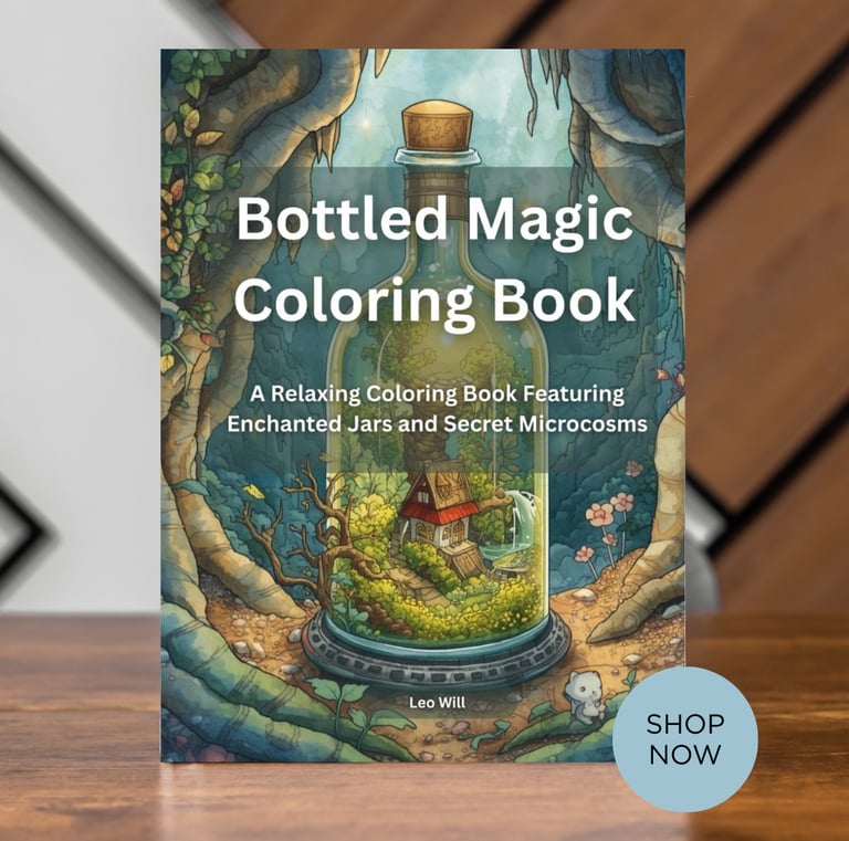 Escape into a whimsical world of miniature wonder with Bottled Magic, a unique adult coloring book featuring 50 enchanting scenes captured inside glass jars.